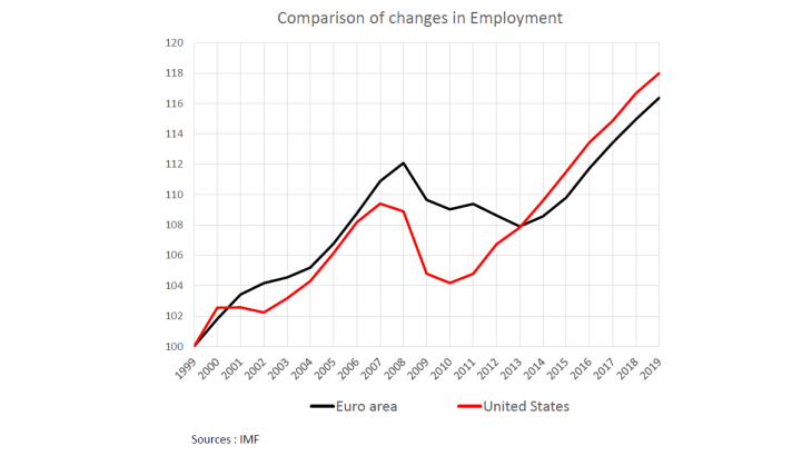 Cumulatively between 1999 and 2019, the real GDP gap amounts to 20 percentage points. Regarding GDP per capita, the cumulative gap is 7 percentage points over the same period. Before the Covid crisis, the gap was also pronounced in employment: