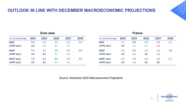 First, the beginning of 2026 confirms the resilience of both the French and euro‑area economies. Despite a rise in global uncertainty, activity continues to hold up well and the disinflation process is now complete.
