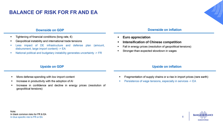 For inflation, the balance of risks was seen as broadly neutral for the euro area and slightly to the downside for France due to imported prices and more muted wage growth.