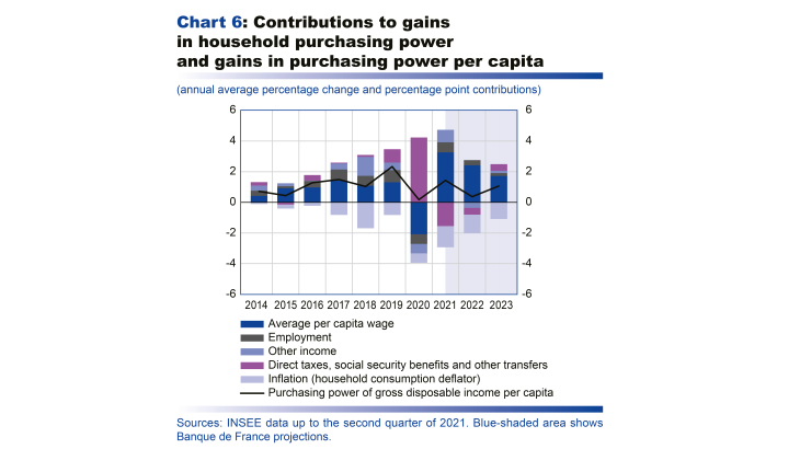 • GDP growth is expected to stand at 6.3% in 2021 as an annual average, and 3.7% in 2022, before returning to just under 2% in 2023. Activity is forecast to return to its pre-Covid level at the end of 2021. The upward revision of our projection for 2021 since June primarily reflects a slightly stronger-than-expected rebound at the end of the first half of the year. After being preserved in 2020 (0.2% on average), household purchasing power is expected to grow by almost 3% cumulatively over 2021-23.