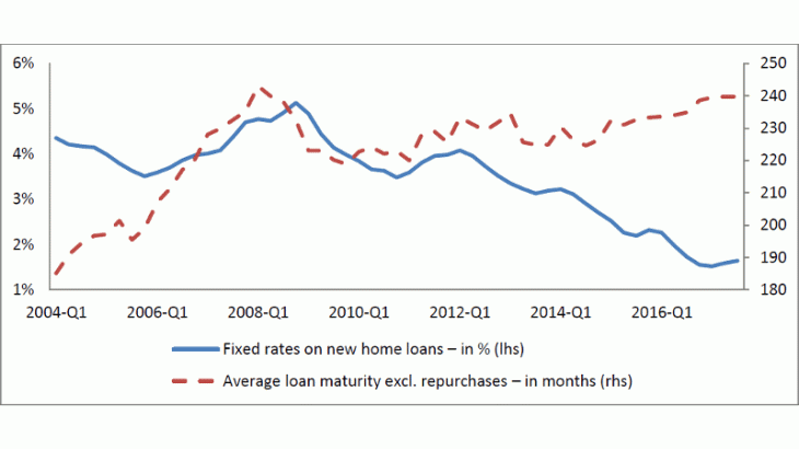 Chart 2 shows the changes in the indicator of households’ borrowing capacity as well as the contributions of lending conditions (interest rate and loan maturity) and gross disposable income per household to the changes in this indicator. After rising sharply by 20% between 2014 and 2016 due to improved lending conditions (hatched area), households’ borrowing capacity stabilised at a high level in 2017.