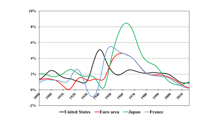 In advanced economies, and particularly Europe, economic growth has slowed in successive phases since the 1970s, falling to its lowest recorded peacetime rate (see Chart 2). The most recent slowdown, which began before the financial crisis, can be attributed to a waning of the contribution of information and communication technologies (ICTs) to growth (Bergeaud, Cette, Lecat, 2016).