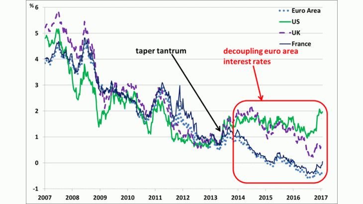 By contrast, during the “Taper Tantrum” (from April to June 2013) , when US Treasury yields surged because investors believed that the Federal Reserve would soon raise policy rates, a comparable increase (of about 70 basis points) in 5 year US interest rates coincided with a 45 basis points increase in the 5 year French rate.