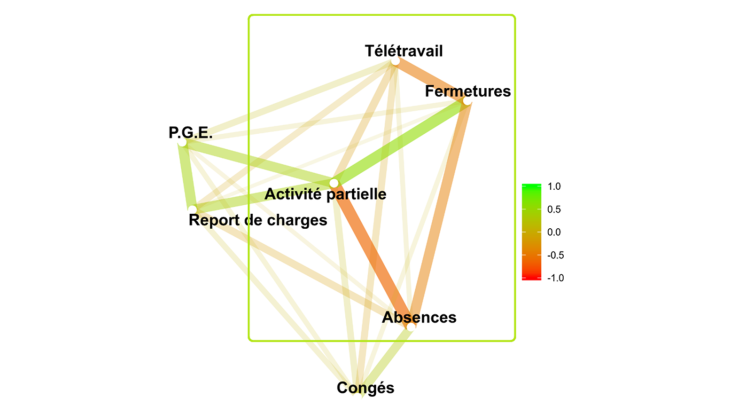 Note : L’intensité de la corrélation entre deux points est matérialisée par la proximité dans le plan, l’épaisseur et l’intensité de la couleur du trait de liaison. Ainsi, le recours à l’activité partielle est fortement corrélé positivement aux fermetures de sites (liaison verte) et négativement à l’absence des salariés (liaison rouge).