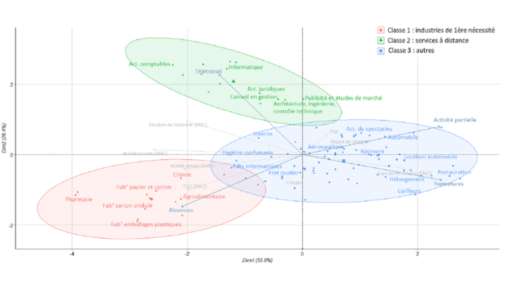 Note : La classe 1 se caractérise par un faible taux de fermetures et un fort taux d’absences, la classe 2 par un recours accru au télétravail et une activité partielle élevée, la dernière par des fermetures importantes et une activité en recul marqué.