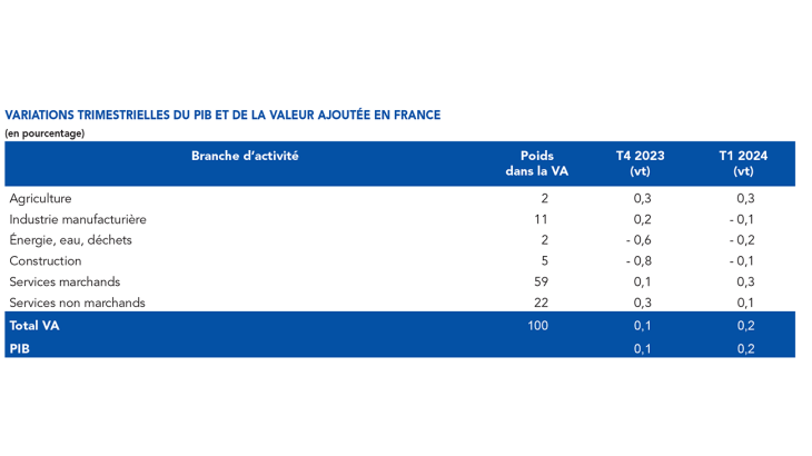 Sur la base des résultats de l’enquête, complétés par d’autres indicateurs, nous estimons que le PIB progresserait au premier trimestre 2024 (de l’ordre de + 0,2 %), après une légère hausse au quatrième trimestre 2023.