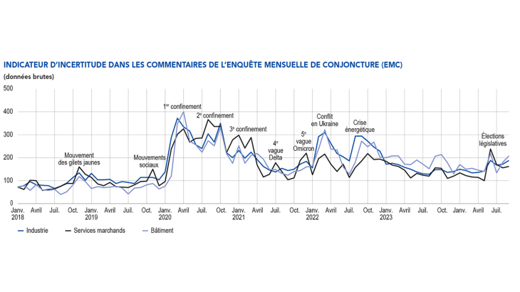 Notre indicateur mensuel d’incertitude, construit à partir d’une analyse textuelle des commentaires des entreprises interrogées, remonte notablement pour tous les secteurs y compris dans les services marchands, alors qu’il avait baissé au cours des deux mois précédents. Les chefs d’entreprise mentionnent l’incertitude sur la politique économique et fiscale nationale, et l’instabilité de la situation géopolitique.