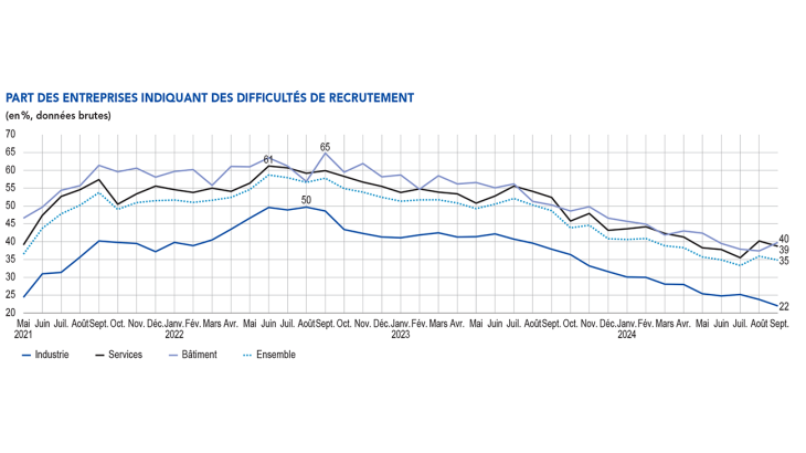 Les chefs d’entreprise ont également été interrogés sur leurs difficultés de recrutement, qui baissent légèrement en septembre après leur remontée du mois précédent : 35 % des entreprises interrogées en font état, après 36 % le mois dernier. Les proportions demeurent plus élevées dans le bâtiment et les services (40 % et 39 % respectivement).