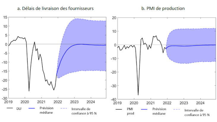 La trajectoire précise de résorption des goulets d’étranglement au niveau de l’offre est bien sûr hautement incertaine. En particulier, les régularités historiques ne peuvent fournir qu’une indication limitée étant donné la nature sans précédent de la crise actuelle. Dans ce contexte, l’évolution future de la pandémie et les mesures prises par les autorités pour y faire face influeront fortement sur la trajectoire des goulets d’étranglement. Par exemple, la mise en place éventuelle de nouvelles mesures de confinement pourrait entraîner un regain de perturbations du côté de l’offre. Toutefois, leur impact économique dépendra essentiellement de leur étendue et de leur ampleur effectives, et de la mesure dans laquelle les chaînes de valeur sont affectées. En outre, les motifs d’épargne de précaution risquent de peser plus fortement sur la demande agrégée en cas d’accentuation de l’incertitude concernant la trajectoire future de la pandémie, sous l’effet par exemple de l’apparition de nouveaux variants ou d’une efficacité moindre que prévu de la vaccination. Ces éléments sont susceptibles de rééquilibrer l’importance des facteurs d’offre et de demande et d’influer sur la dissipation des effets liés aux goulets d’étranglement. Deuxièmement, les intervalles de confiance larges du graphique 3 indiquent que même dans des conditions relativement stables, sans nouvelles perturbations liées à la pandémie, les trajectoires prévues des délais de livraison et du PMI de production manufacturière sont entourées d’une incertitude statistique significative. Troisièmement, l’existence de facteurs non liés aux goulets d’étranglement, susceptibles de contribuer en partie au choc d’offre identifié, risque d’aboutir à une surestimation des effets liés aux goulets d’étranglement au niveau de l’offre. Enfin, l’indice des DLF ne reflète probablement pas entièrement les effets des goulets d’étranglement non liés aux délais de livraison, ce qui impliquerait une sous-estimation de l’effet global.