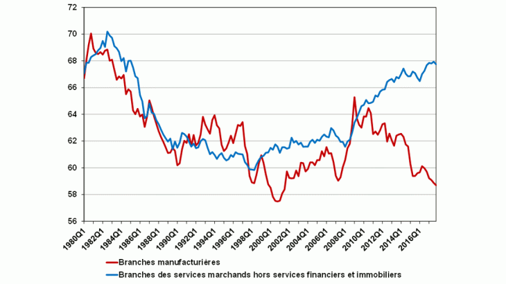 Les évolutions apparaissent très contrastées (Graphique 2). Dans les deux branches, la part des rémunérations était en 2008 à un niveau proche de celui des années 1990, avec des fluctuations cycliques sur la période. Cette part a ensuite fortement progressé dans les services marchands, atteignant fin 2017 un plus haut depuis 1985. En revanche, après un pic cyclique en 2010, cette part a fortement baissé dans l’industrie manufacturière pour revenir à un point bas seulement observé au début des années 2000.