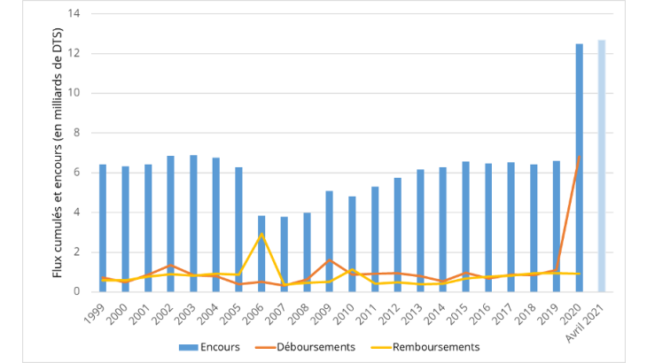 La crise de la Covid-19 a montré la nécessité d’une réforme ambitieuse, notamment d’un changement d’échelle du dispositif du FMI en faveur des PFR. Grâce notamment à l’existence d’une facilité rapide de crédit et au relèvement temporaire des plafonds d’accès, le FMI a pu répondre rapidement à la crise, touchant plus des deux tiers des pays éligibles à la FRPC, avec une multiplication par 6 de ses nouveaux engagements en 2020, dont l’encours a atteint 12,5 milliards de DTS à fin décembre (graphique 2). S’y ajoute notamment une initiative de suspension du service de la dette aux créanciers publics bilatéraux jusqu’à fin 2021 (DSSI). Cet effort a pourtant été insuffisant pour répondre aux besoins de financements externes des PFR, notamment parce que ceux-ci explosent et que les autres financements concessionnels, notamment bilatéraux, sont plus contraints.