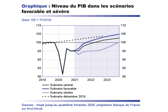 Cette projection reste particulièrement liée à l’évolution de la situation sanitaire en France et dans le monde, qui pourrait jouer à la hausse comme à la baisse. Ce degré élevé d’incertitude nous conduit à encadrer notre projection par deux scénarios alternatifs, l’un reposant sur des hypothèses sanitaires plus sévères, l’autre sur un environnement plus favorable (cf. encadré).