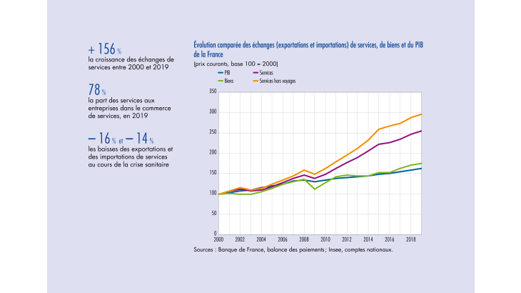 Les avancées technologiques dans le domaine de l’information et des télécommunications, et les efforts de libéralisation des secteurs de services dans le monde, ont fortement accru la quantité d’activités commercialisables au‑dela des frontières nationales. En outre, depuis la conclusion de l’Uruguay Round en 1994, le commerce de services bénéficie à l’instar du commerce de biens d’un accord, le General Agreement on Trade in Services (GATS), visant à faciliter les échanges internationaux. Au cours des vingt dernières années, la France a su pleinement bénéficier de cette nouvelle donne en intensifiant ses échanges de services avec le reste du monde et en s’intégrant aux chaînes de valeur mondiales. La part des flux touristiques a diminué, et les entreprises françaises sont devenues davantage importatrices et exportatrices de services aux entreprises. En outre, les échanges de services ont engendré un excédent commercial pour la France sur toute la période concernée.